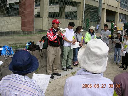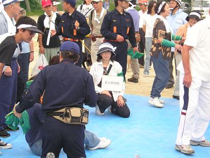 | 子供達に大人気?の水風船投げ消火 | 消防団員による三角巾救護の説明 |
