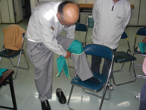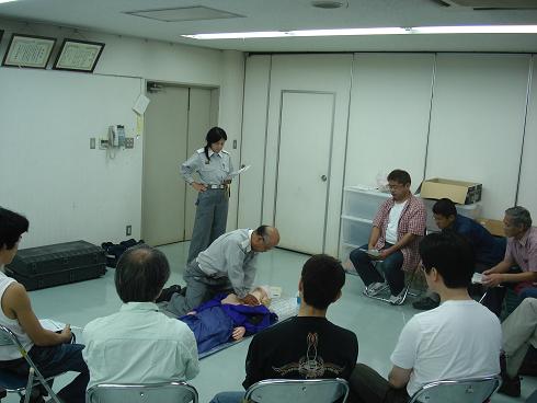 6月17日、松戸市消防局の協力を得て、松戸市大金平消防署において救命講習会を開催しました。 今回は新しいガイドライン2005に基づいて救急救命に必要な心配蘇生法、AEDの取扱い、三角巾を用いた応急処置法、傷病者の搬送法などの実技を行いました。 全員、もしもの時に備えて真剣に受講しました。 今後も実施したいと思います。(繰り返しが大切です。)