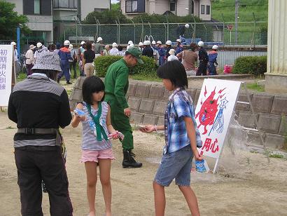 | 子供達に大人気?の水風船投げ消火 | 消防団員による三角巾救護の説明 |