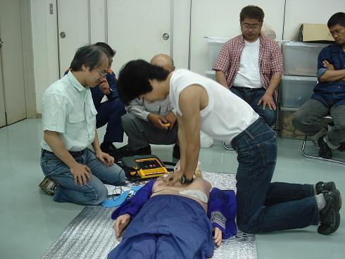6月17日、松戸市消防局の協力を得て、松戸市大金平消防署において救命講習会を開催しました。 今回は新しいガイドライン2005に基づいて救急救命に必要な心配蘇生法、AEDの取扱い、三角巾を用いた応急処置法、傷病者の搬送法などの実技を行いました。 全員、もしもの時に備えて真剣に受講しました。 今後も実施したいと思います。(繰り返しが大切です。)